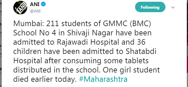 जानकारी के मुताबिक, शिवाजी नगर में जीएमएमसी (बीएमसी) स्कूल नंबर चार के 211 छात्रों को राजवाड़ी अस्पताल में भर्ती कराया गया है। 36 बच्चों को शताब्दी अस्पताल में भर्ती कराया गया है। आज एक छात्रा की मौत हो गई। सभी ने स्कूल में वितरित की गई दवा का सेवन किया था, जिसके बाद से इनकी तबीयत खराब हो गई।